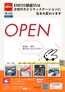 お知らせ 10/08(水) 都盛SSは生まれ変わります! 都盛SSは次世代モビリティステーションに うまれかわります! 10月1日に中古車買取のラビットの サテライト店になりました✨ 査定もお気軽にお申し付けください。 また、11月下旬より1ヶ月程度 リニューアル工事予定となっております。 サンクスモビリティ株式会社 都盛SS 053-442-4801 本社 0532-55-6015
