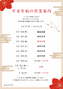 お知らせ 12/17(水) 年末年始の営業時間のお知らせ(monoPLACE) monoPLACEの年末年始の営業時間を お知らせいたします! 下記のファイルをご確認ください。 クリックすると大きく表示されます。